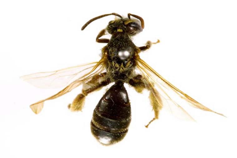 암컷은 12m. 몸은 흑색이고 가슴과 등면에 다소 짧은 황갈색 털이 있다. 머리 방패는 잘 융기 했고 중앙부에 조금 광택이 있고 성긴 점각이있다. 배는 미세구조가 강하고 광택이 없다. 수컷의 더듬이 제3마디는 짧고, 제4마디 이하는 길어져서 앞으로 구부러졌다.