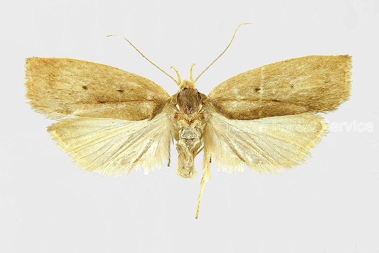 앞날개는 넓고 끝이 다소 뾰족하며 전체가 직사각형에 가까움. 바탕색은 황갈색이며, 중실의 안쪽과 끝쪽에 명료한 1개씩의 흑색 점이 있음. 앞날개의 외측 절반의 맥상이 잘 비춰 보임. 뒷날개는 황백색이며 넓음.